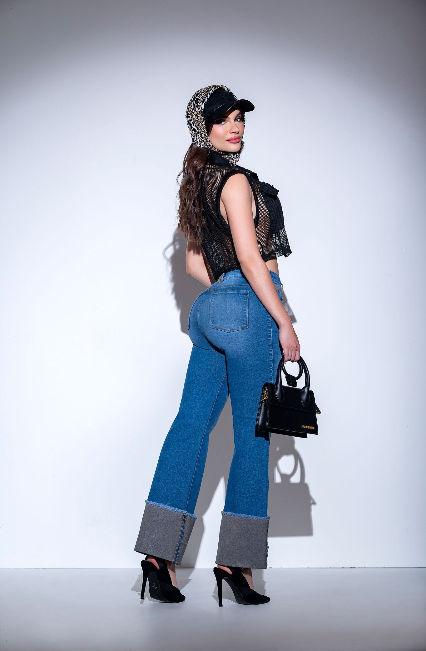 Jean Tiro Alto 1 Botón - Bota Palazzo Con Ruedo Hacia Arriba Ref 1600